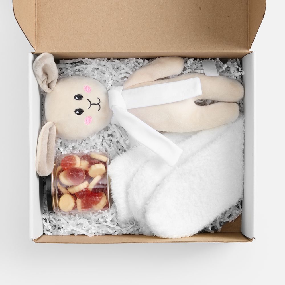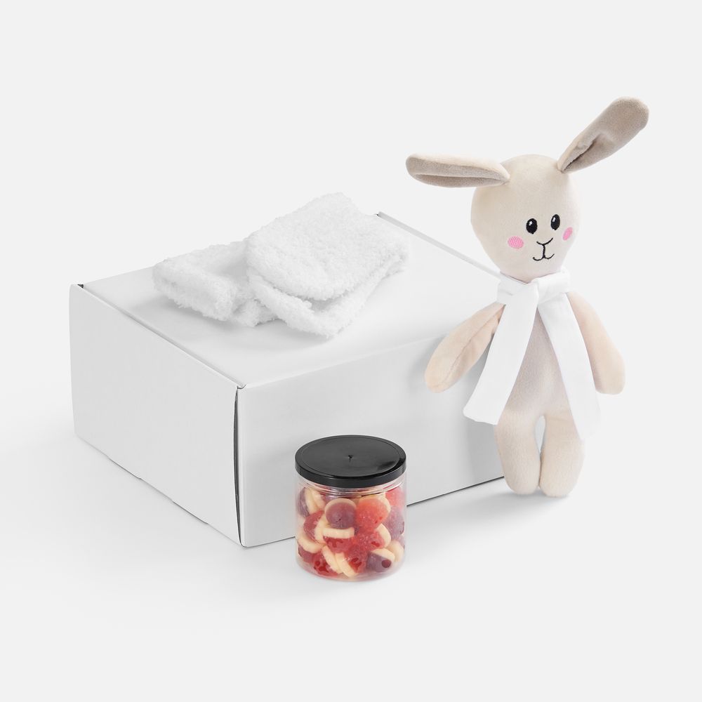 Белые носки, милый плюшевый заяц и мармелад с нежным вкусом — сочетание, перед которым будет трудно устоять любому. Зайчик с трогательными ушами непременно вызовет улыбку, а его симпатичный шарф станет еще более стильной деталью и главным акцентом всего набора после персонализации.